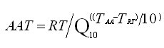 AAT:加速老化時(shí)間;RT:實(shí)時(shí)老化時(shí)間;Q10:溫度升高或降低10℃的老化系數(shù);TAA:加速老化溫度;TRT:預(yù)設(shè)的實(shí)際貯存溫度。