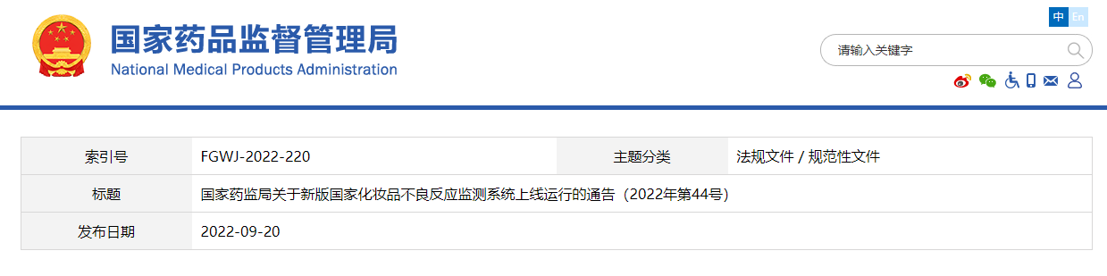 為貫徹執(zhí)行《化妝品監(jiān)督管理?xiàng)l例》《化妝品生產(chǎn)經(jīng)營監(jiān)督管理辦法》《化妝品不良反應(yīng)監(jiān)測管理辦法》,加強(qiáng)化妝品不良反應(yīng)監(jiān)測工作,提高化妝品不良反應(yīng)報(bào)告、分析、評價(jià)工作效率,國家藥監(jiān)局組織對國家化妝品不良反應(yīng)監(jiān)測系統(tǒng)進(jìn)行升級完善,新版系統(tǒng)將于2022年10月1日起上線運(yùn)行,F(xiàn)將有關(guān)事項(xiàng)通告如下: